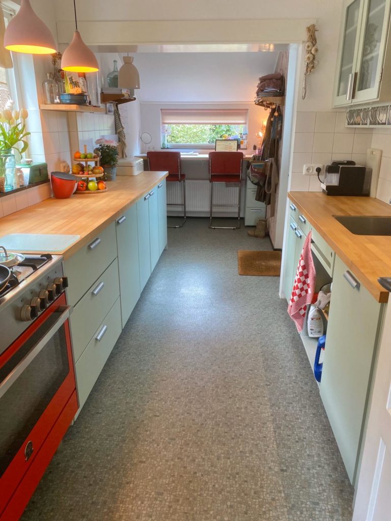 Mijn werk doe ik vooral in de bovenkamer, in mijn eigen hoofd. Dat kan overal, want ‘die heb ik altijd bij me’. Tijdens het wandelen, in de auto, of achterin de tuin; ik denk altijd na. Natuurlijk heb ik ook een fysieke werkplek, die is nu een half jaar oud. Het is de fijnste plek ever. We hebben geen groot huis en we hebben nooit echt verbouwd, maar vorig jaar zijn we de keuken gaan verbouwen. Het is de Piet Zwart keuken van Bruynzeel geworden. Ook hebben we een muurtje doorgebroken en er een stuk aangebouwd. Dat is nu mijn werkplek.