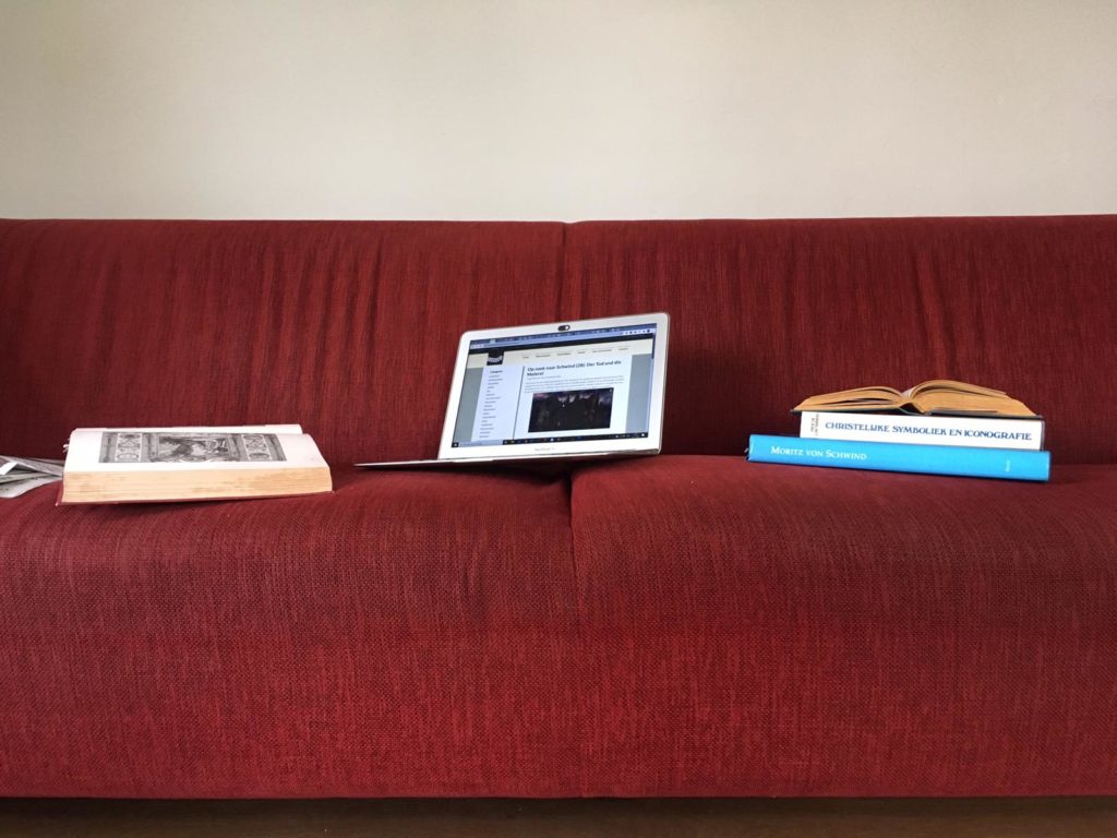 Bea werkt nog steeds beneden, het liefst op een vaste computer. Sinds ik mijn laptop heb, werk ik niet meer beneden. Interviews zijn steeds vaker telefonisch en het is lastig als je dan tegenover elkaar zit. Het was storend en het aantal telefoongesprekken nam toe. Boven is ook meer ruimte. Ik zit graag op de bank, met links en rechts van me een stapel boeken. Dat lukte niet op het bureau. Daar lagen wel dingen op, maar het was niet handig. Ze zeggen: creatieve mensen hebben geen rommel, die hebben overal ideeën liggen. Mijn bureau lag daar vol mee, maar mijn ideeën waren niet makkelijk terug te vinden. Nu heb ik mezelf aangewend om dingen op te slaan op mijn telefoon of laptop. Dat werkt beter.
