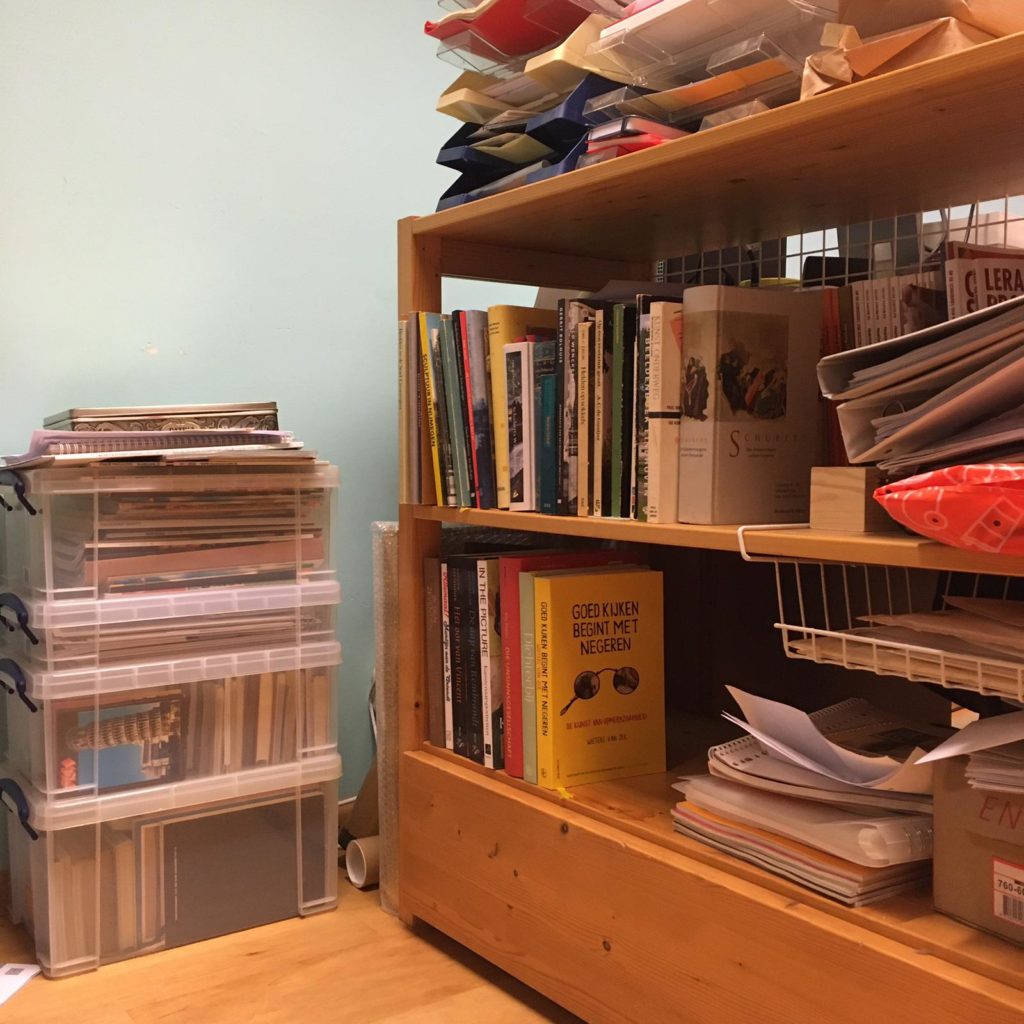 Mijn bureau stond eerst in het souterrain. Ons hele huis is onderkelderd, en we hebben daar een ruimte van 3,5 bij 5 meter. Bea en ik hadden daar onze twee werkplekken, twee dezelfde bureaus met twee computerschermen tegen elkaar. Over het scherm konden we naar elkaar kijken. Zo hebben we een jaar of vijftien gezeten. Afgelopen najaar is die ruimte veranderd. Bea kreeg toen via haar nichtje het oude bureau van haar vader. Mijn bureau is naar een andere hoek van het souterrain gegaan en fungeert nu als werkbank. In de kantoorruimte is hierdoor meer ruimte ontstaan voor boekenkasten. We hadden daar al een wand met boeken over kunst en naslagwerken, taal- en literatuurboeken, maar er is nu meer ruimte voor Bea’s jeugdboeken en mijn Italië-bibliotheek.