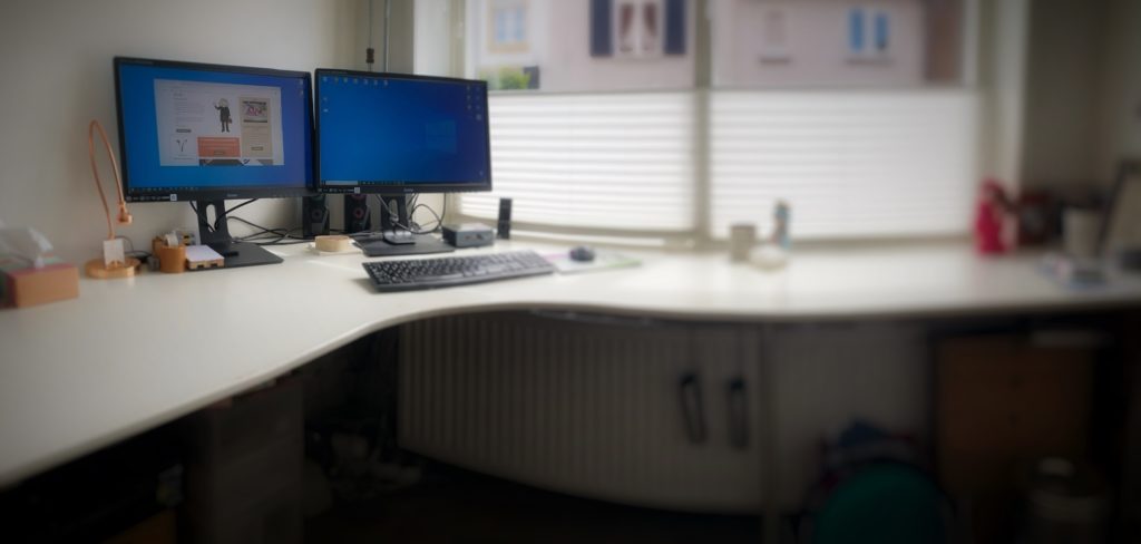 Mijn werkplek is mijn cockpit. Ik eet daar meestal ook. Het is gewoon een fijne plek om te zijn en door de verbouwing is het nog prettiger geworden. Werken met twee schermen als één groot bureaublad is ideaal. Dat zag ik voor het eerst tijdens de detachering en ik heb dat thuis ook geregeld. Links is mijn checkscherm voor input, rechts mijn werkscherm. Ik werk met een desktop en nam eerst altijd een usb-stick mee als ik op locatie ging werken. Nu heb ik ook een laptop die ik kan meenemen naar een klant. Alles staat op beide computers. Nu met corona doe ik de Teams-vergaderingen op de laptop en zet op de twee schermen open waar we het over hebben.