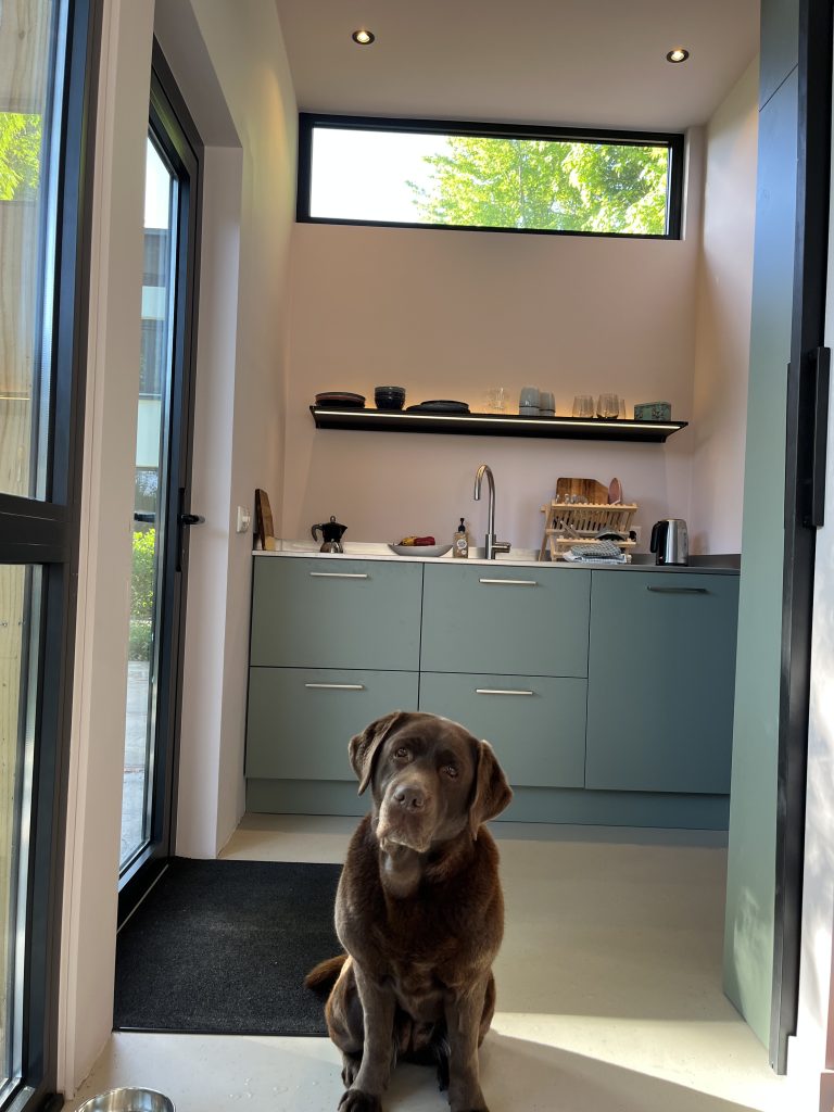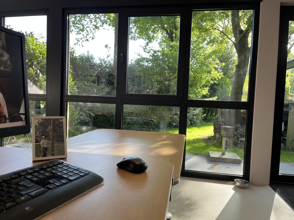 Eind 2024 hebben we dit tuinhuisje gebouwd. Het is van hout en goed geïsoleerd, heeft een gevel van glas en vloerverwarming. Van binnen is het een soort van een grote ruimte, vrij hoog en licht met ook ramen bovenin. Bij binnenkomst is links een keukenblokje, rechtdoor een badkamer met wc en douche en aan de rechterkant is de werkruimte. Tussen het keukentje en de werkruimte zit een schuifwand, zodat ik ze kan scheiden. Vanuit de werkruimte heb ik uitzicht op de tuin met gras, bomen, struiken en een houtopslag. Soms spelen daar twee muisjes tikkertje, heel grappig.