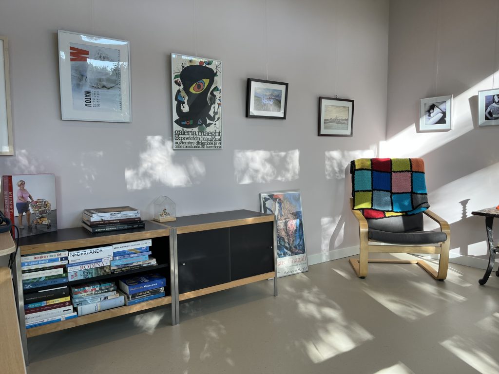 De wanden hangen vol kunst. Posters van exposities die we ooit bezochten, foto’s en houtsneden. In de ruimte staat ook een foto van mijn vader en mij. Mijn vader is overleden, maar had een enorm schrijftalent. Zijn luchtige pen is inspirerend voor me, net zoals die van Simon Carmiggelt. Op deze foto ben ik ongeveer vier jaar oud. Ik sta op een klimrek en mijn vader staat eronder om mij op te vangen. Ik kijk semi-trots en angstig, omdat het klimrek toch wel hoog is. Verder heb ik een zelfgemaakt kommetje van pottenbakken dat verrassend goed is gelukt, en een deken van kleine vierkantjes die mijn oma in het verpleeghuis heeft gebreid. Ondanks haar beperkingen bleef ze creatief en na haar overlijden heeft de activiteitenbegeleider de vierkantjes aan elkaar genaaid tot een deken. Dat vind ik heel lief.